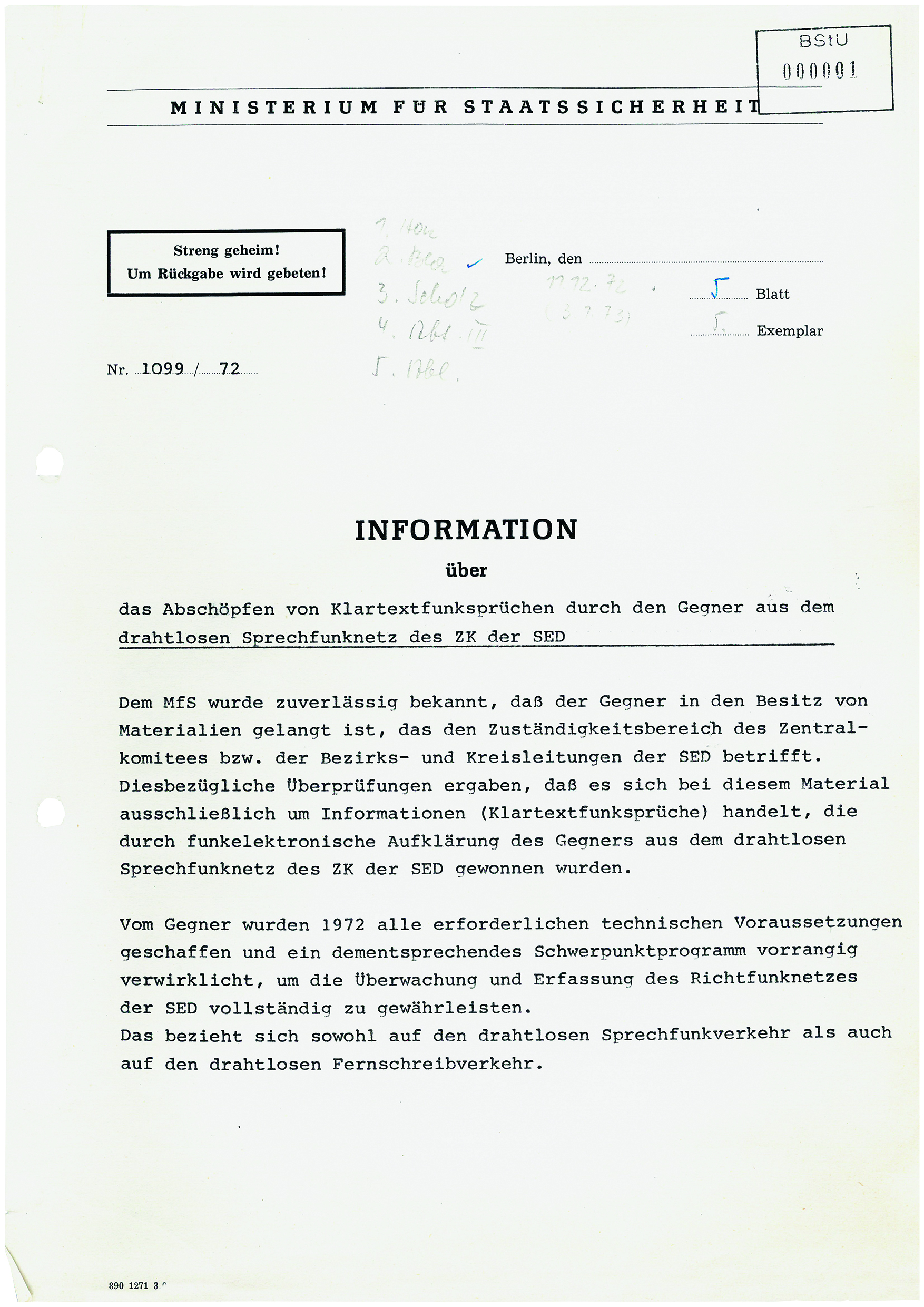 Information Nr. 1099/72 über das Abschöpfen von Klartextfunksprüchen durch den Gegner aus dem drahtlosen Sprechfunknetz des ZK der SED